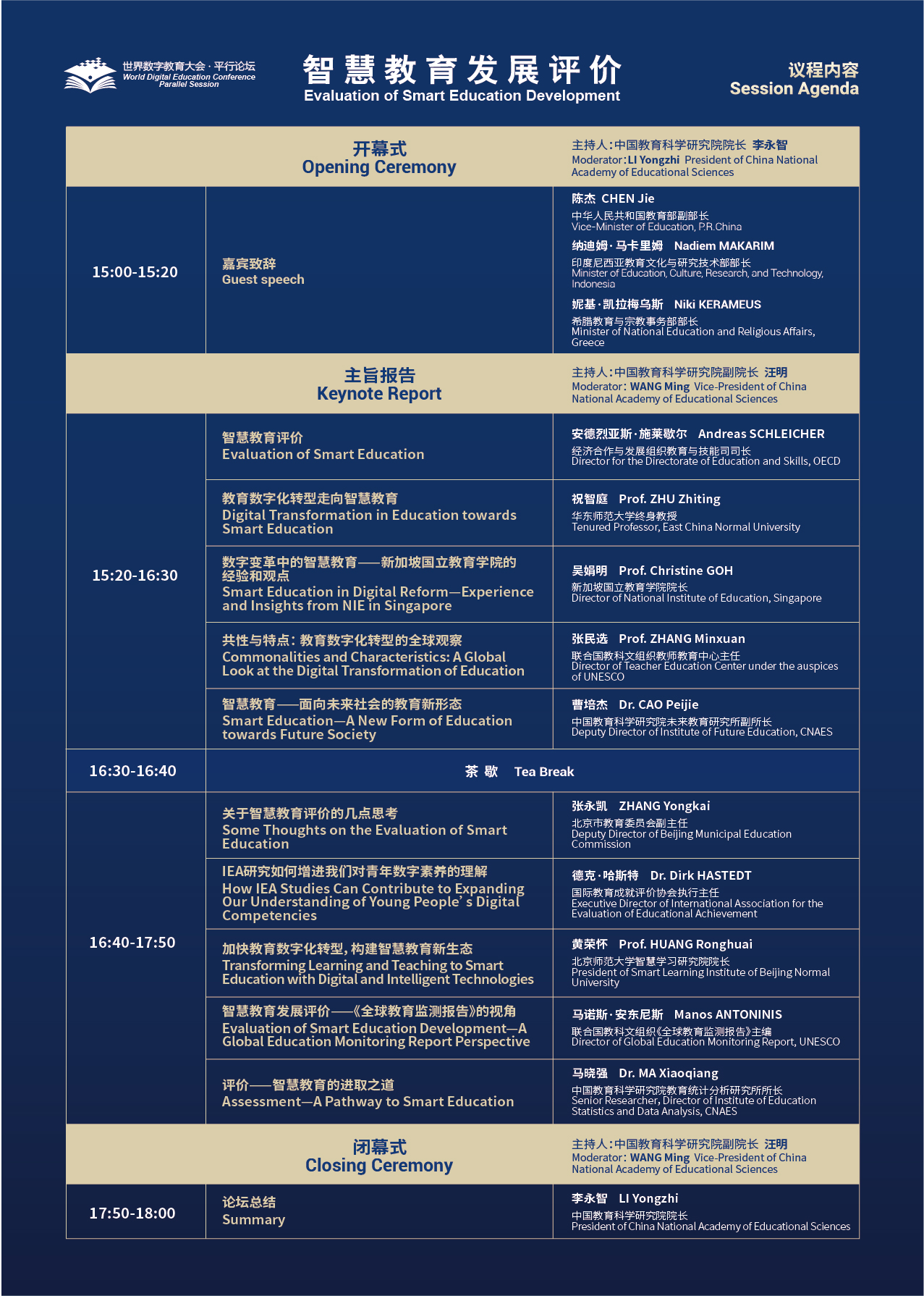 WDEC is composed of a plenary session and 4 parallel sessions. The parallel session on "Evaluation of Smart Education Development", held on 14 February, organized by China National Academy of Educational Sciences, will bring together renowned experts on smart education from across the globe, to discuss ideas and policy of Smart Education in the digital era, as well as the mechanism to evaluate the level of development of Smart Education. Through global and comparative perspectives, participants will discuss the principles and methods for evaluation and analyze the current level of smart education development in the world, in an effort to seek theoretical consensus, share best practices and advance the future development of smart education. The session will also introduce China’s Strategic Action Plan for Education Digitalization, progress of the Smart Education of China (SEC) platform, an online portal of educational resources and tools, and China Smart Education Bluebook (2022),Report on China Smart Education Development Index 2022.